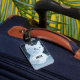 A luggage tag with an adorable photograph of a white short-haired kitten with bright blue eyes. Staring off into the distance.