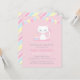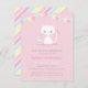 A cute white kitty cat birthday party invitation for girls who love kittens and cats! The white kitten has a pink bow tied on her tail with a collar that has a paw print icon. Besides the kitty is a little cake with a candle and fish decor. The top has colourful bunting flags for a touch of party atmosphere. Pastel colour palette of pink, blue, yellow and white. Personalize easily with your birthday party details.