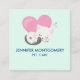 A business card with an adorable graphic illustration. A white kitty cat with a cute paw print image on her fur. Sleeping peacefully. A big pink heart behind her and some little stars too. Mint green background.