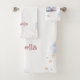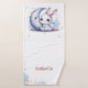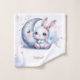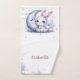 Super cute bathroom towel set featuring cute white little bunny wearing a beautiful pink bow sitting near the silver crescent moon with some gold falling stars.