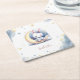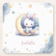 Super cute paper coaster featuring cute white little bunny wearing a beautiful blue bow sitting on a lovely moon with some gold falling stars and some dusty blue clouds.
