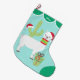 An adorable white llama wears a red Santa hat on the front of this personalized Christmas stocking. Behind him another Santa hat hangs on a green cactus. At his feet is a brightly wrapped gift package. The top of the stocking has a teal green scalloped border with your custom text in white. A matching toe patch design completes the front. The back of the stocking has the same light blue background, border and toe design, with another portrait of the llama. A cute southwestern design for the Holiday Season!