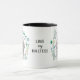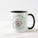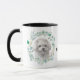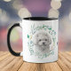 "LOVE MY MALTESE" declares this mug for the Maltese Dog owner. Each side of the mug has a beautiful watercolor portrait of an adorable white Maltese in a blue green leaf wreath. Between the two images is the text, which may be easily customized, or even removed, by you.