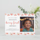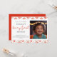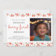 Cute and simple red and white photo girl berry first birthday horizontal invitation with a pattern of strawberries. This invitation was illustrated and designed by Patricia Alvarez.