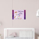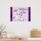 Welcome baby shower poster. Designed with a white mama unicorn with fancy colourful mane and tail. A baby unicorn laying down beside her, with a green pacifier in its mouth. A colourful rainbow with fluffy clouds, and some stars and heart decorate this sweet and adorable design. A bold pink outline surrounding the image gives it a child-like doodle vibe. Light purple-pink pastel coloured background. The left and ride side borders have a purple-pink faux-glitter image.