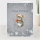 A cute grey mouse dressed for winter in a stocking cap and scarf holds berries and wishes you “Happy Holidays.” It is surrounded by a white snowflake design. The greeting can easily be changed to anything you prefer.