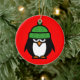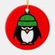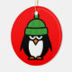 Cute winter penguin cartoon Christmas ornament. Personalizable with text or photo on the back. Add your xmas greeting or wishes like Merry Christmas! Funny penguin cartoon with green wool hat.