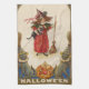 This cute little witch loves her kitty. This vintage Halloween print depicts a cute little witch holding her black cat, black cats lining the edges and a jack o' lantern.