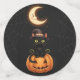 Invite your guests to a spooktacular celebration with this adorable Halloween design. Featuring a charming black cat in a witch's hat perched on a carved pumpkin under a crescent moon, this design is perfect for a fun, not-so-scary party. Easily personalize with all your event details.