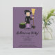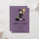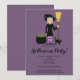 This Halloween party invitation card design features Destei's fun cartoon illustration of a cute witch girl who is holding a broom. The witch is wearing a black hat and outfit and she has purple and grey striped socks. Her hair is light grey and it is long. There is a black cat by her feet and the background colour is purple. Personalize the text areas with the details of your event.