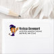 Return address labels with a cute witch wearing a big purple witches hat. Her black cat resting on top her head. She has long orange hair and is carrying a broom. Cute cartoon illustration perfect for halloween.