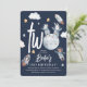 Super cute Woodland Animal Space themed 2nd Birthday invitation. Design features the title 'TWO' incorporating a moon, decorated with adorable woodland animals as astronauts, rockets, stars and clouds. The trendy template is a combination of elegant hand written script and serif white fonts. All text is easy to customize using the template provided.