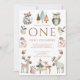 Whimsical boho style painted woodland animals turning one themed baby shower invitation, with baby forest animals, mushrooms, acorns, and trees encircling the text of the invitation.