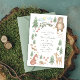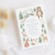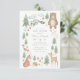 Gender Neutral baby shower invitation with hand-illustrated woodland forest scene with trees, flowers, mushrooms, bear, bunny, raccoon, squirrel, deer, bird, fox, and hedgehog.