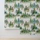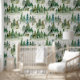 Cute whimsical wallpaper printed with a unique hand painted watercolor pattern of woodland animals against white background. Fun playful pattern for a nursary or kids' playroom. Gender neutral, great for boys as well as girls. Misty forest, green trees would also look nice in an adult bedroom, creating a relaxing, calming atmosphere. You will love it if you are a nature and art enthusiast.