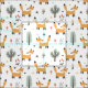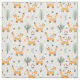 A happy little gold fox is the feature on this cute fabric. Along with the fox images are trees and forest flowers. Everything is placed on a white background.