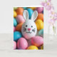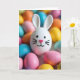 Designed with a sweet spring scene, the card features a smooth white, egg-shaped bunny figure 🐰 with tall upright ears at the center, drawing your eye right away. Its face is kept simple with two small black dot eyes, a thin curved smile, and short black whisker lines that give it a shy, friendly look. A textured pink heart forms the nose, adding a gentle romantic touch, like a quiet sign of affection. Around the bunny sits a scattered ring of oval egg shapes in sunny yellow, soft blue, light pink, warm orange, and a few touches of leafy green 🌷. The background is softly blurred so the colored eggs melt into a glowing halo that feels like a cozy spring gathering. Near the top, a short Easter greeting appears in a light, easy-to-read style, set in a soft pastel shade that stands out against the pale background. The lighting is diffuse and bright, with the pink heart nose catching the light and the surrounding eggs fading into a dreamy, colorful haze.