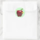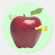 A very red apple with one yellow and one green cute worms. One is coming out of a little hole on the fruit.