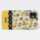 White background with a bee honeycomb pattern and happy smiling bumble bees. Decorated with yellow honeycomb shapes in the background. Personalize and add your text on golden and black hexagons.