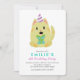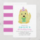 Adorable birthday party invitations feature a sweet illustration of a yellow cat holding a present and wearing a party hat.