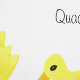 Cute yellow ducks with orange beaks and feet pattern. Quack quack script typography against white background. Original Artwork by TamiraZDesigns.
