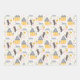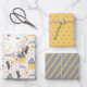 This cute baby shower gift wrap trio is gender neutral friends and perfect for either a boy or a girl. Gift wrap paper sheet #1 has a whimsical design with puppies, yellow birds, cute houses and botanical and floral accents. Gift wrap paper #2 has a yellow background with grey polka dots. Gift wrap paper #3 has a grey background with diagonal yellow stripes.