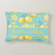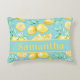 Accent pillow with a cute yellow lemon pattern on light blue, and space to add a name on both sides
