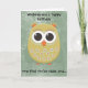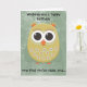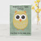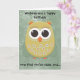Birthday card with a cute yellow, orange and green owl on a green grunge background. Text says, "Wishing you a happy birthday, now that you're older and....older. Oh, well, Happy Birthday."