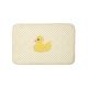 Cute kid's bath mat done in a yellow and white quatrefoil pattern, with cartoon graphics of a yellow rubber ducky, in the middle. Matching bath decor is available.