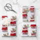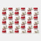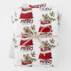 The repeated pattern on these Christmas wrapping paper sheets is an image of an adorable Yorkshire Terrier dog peeking out from a red and white Holiday gift bag. Behind him is a sprig of holly and red berries. Stylized red and black buffalo plaid text says MERRY CHRISTMAS". The background on two of the sheets in this set is white, while the third sheet is silver.