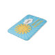 A bathroom mat with a cute little sun in front of a white cloud and shining its rays out in a sunburst blue background. The design is treated with a shadow effect to add depth. The text "A little sunshine is on the way!" is not editable. Cute, cheerful and bright! Personalize with child's name in the little cloud.