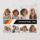 Front - 8 Photo template in a simple grid with a white border. A fun, retro stripe pattern with red, gold and blue on a black background. and a simple font make a modern, minimal design to send to friends.
