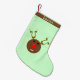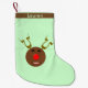 This awesome Christmas stocking features a funny cartoon of a Reindeer. He has beady black eyes and a huge bright red glowing nose. The antlers are pointing up and look futuristic making this reindeer a cyber reindeer. He is still cute and friendly though. There is customizable text at the top of the stocking so it can be personalized.