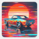 A sleek, retro-futuristic muscle car cruises through a neon-lit landscape, reflecting the vibrant colours of a glowing sunset. The scene captures the essence of vaporwave aesthetics with its dreamlike, cyberpunk vibe