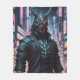 This intense image portrays a menacing demon samurai, adorned with a futuristic, dark outfit and a mask with glowing red eyes and horns. Set in a neon-lit, urban environment inspired by cyberpunk aesthetics, the character stands amidst numerous illuminated signs and symbols, suggesting a bustling, high-tech cityscape.