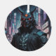 This intense image portrays a menacing demon samurai, adorned with a futuristic, dark outfit and a mask with glowing red eyes and horns. Set in a neon-lit, urban environment inspired by cyberpunk aesthetics, the character stands amidst numerous illuminated signs and symbols, suggesting a bustling, high-tech cityscape.