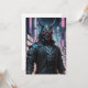 This intense image portrays a menacing demon samurai, adorned with a futuristic, dark outfit and a mask with glowing red eyes and horns. Set in a neon-lit, urban environment inspired by cyberpunk aesthetics, the character stands amidst numerous illuminated signs and symbols, suggesting a bustling, high-tech cityscape.