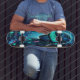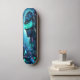 "Dive into the depths of the digital world with the 'Cyberspace Conqueror: Hacker's Realm Skateboard Deck'. This design portrays a futuristic hacker, eyes aglow with digital prowess, navigating the complex realm of cyberspace. Surrounded by streams of code and cybernetic interfaces, the hacker stands in a virtual reality landscape, a digital grid alive with floating geometric shapes and holographic data panels. The electric blue and neon green colour scheme against dark shades encapsulates the enigmatic and immersive world of hacking.