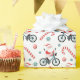 Creative biking holiday gift wrap featuring cartoon cyclist Santa cycling surrounded by Christmas treats.