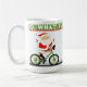 Creative cycling Christmas holiday gift mug featuring Santa cyclist riding a bike and funny holiday line.