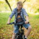 Cycling Life, retro painting in orange and blue of a cyclist riding through the mountains and forest with the sun in the background