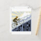 graphic design illustration of a Cyclist racing bike up steep mountain and clouds sunburst done in retro WPA style.