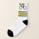 Cyclist riding his bicycle socks that displays a minimalist icon of a black cycling silhouette wearing a yellow top and your name with a yellow and black striped border.