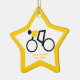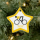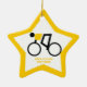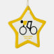 Cyclist riding his bicycle ceramic ornament in star shape that displays a minimalist icon of a black cycling silhouette wearing yellow top and your text on white background with yellow border.