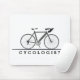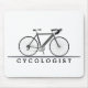 Cycologist in white text on black with dark grey bicycle on grey line.