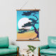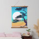 Hanging Tapestry in a Japanese inspired silhouette of a cypress tree, framing a full moon, against an aqua and coral orange sky