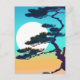 Postcard in a Japanese inspired silhouette of a cypress tree, framing a full moon, against an aqua and coral orange sky