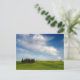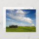 Postcard of a group of cypress trees in a landscape with green hills and yellow flowers under beautiful white clouds near Torrenieri in the Val d'Orcia (Orcia valley) in Tuscany, Italy.