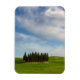 Vertical souvenir photo magnet of a group of cypress trees in a landscape with green hills and yellow flowers under beautiful white clouds near Torrenieri in the Val d'Orcia (Orcia valley) in Tuscany, Italy.