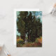 Cypresses with Two Female Figures by Vincent van Gogh is a vintage fine art post impressionism landscape portrait painting. A beautiful image to represent lasting friendship. A nature view of cypress trees with two women peasants walking on a summer day with white clouds swirling in the blue sky. Best friends taking a walk down a tree lined path.